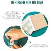 Our collection comes thoughtfully presented, each piece placed on our signature mint striped card within a beautiful box. Wrapped then in tissue paper, the finishing touch for effortless gifting.