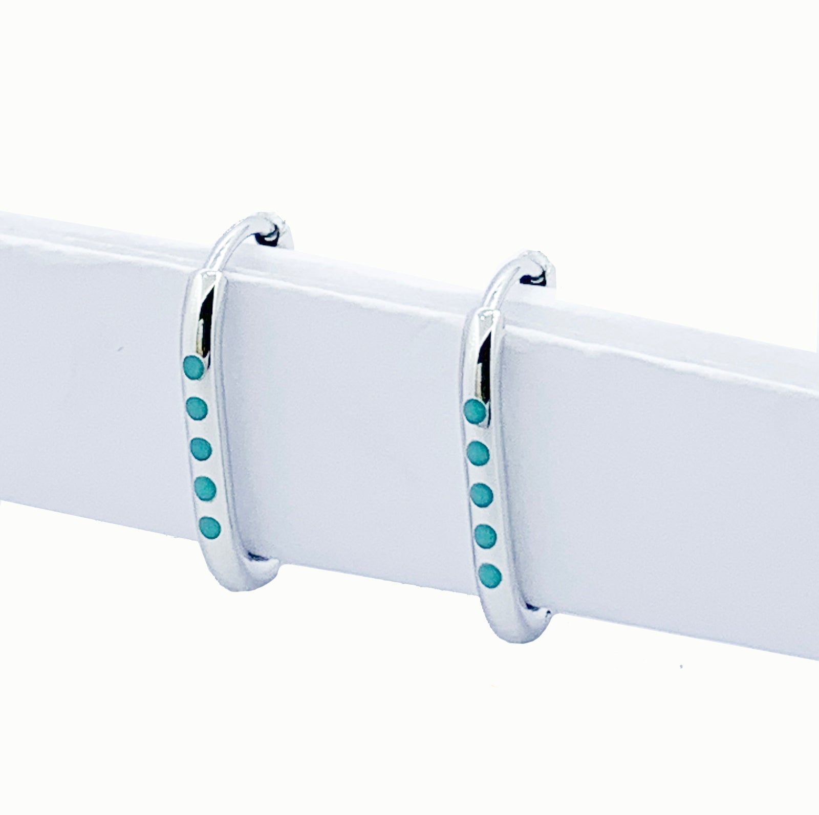 Huggie Size 10mm x 15mm Made from Rhodium plated stainless steel with turquoise enamel.