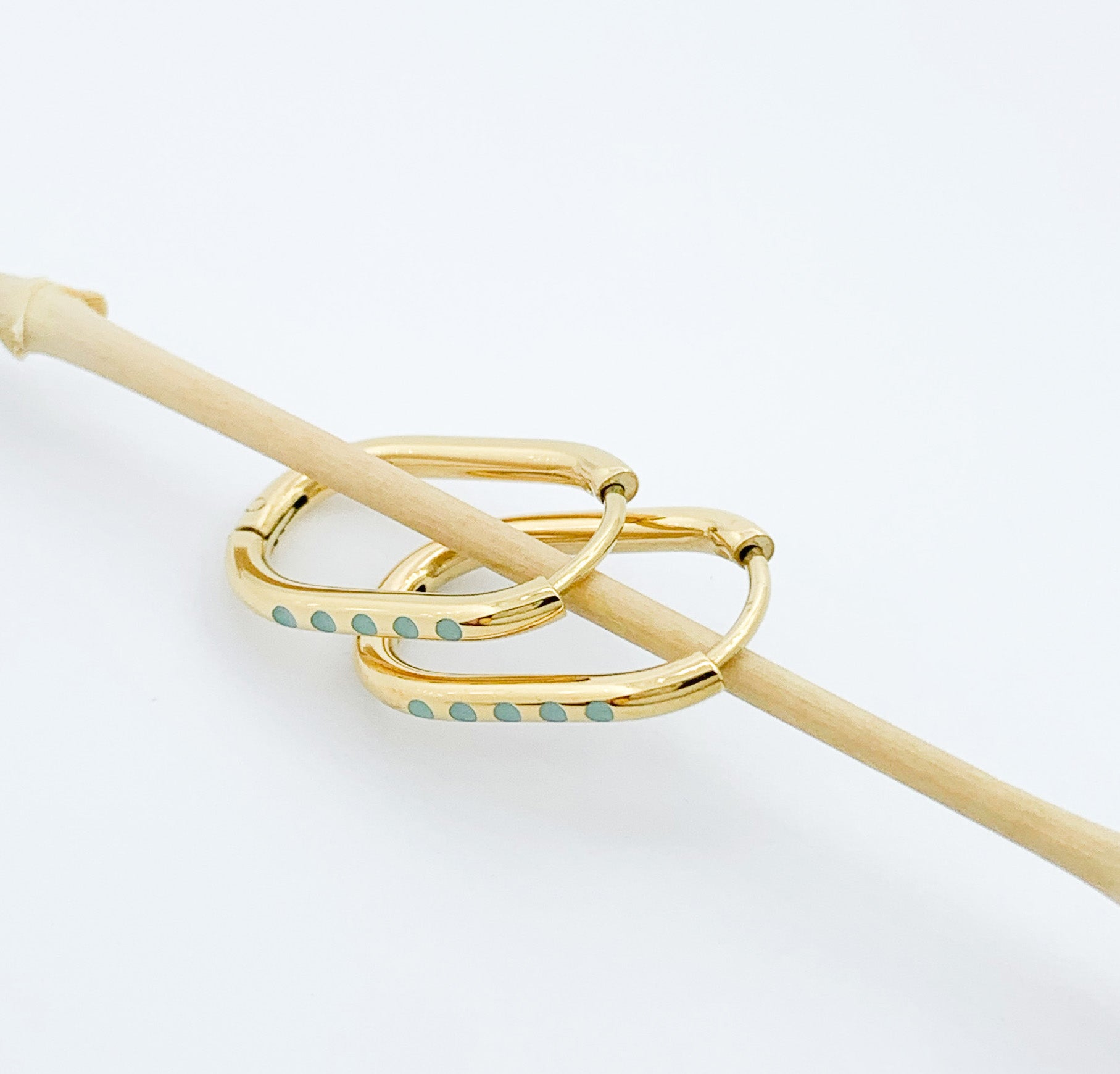 These sleek and stylish rectangle hoop earrings are made from gold plated stainless steel with pops of mint enamel. Hinged opening so easy to take on and off.